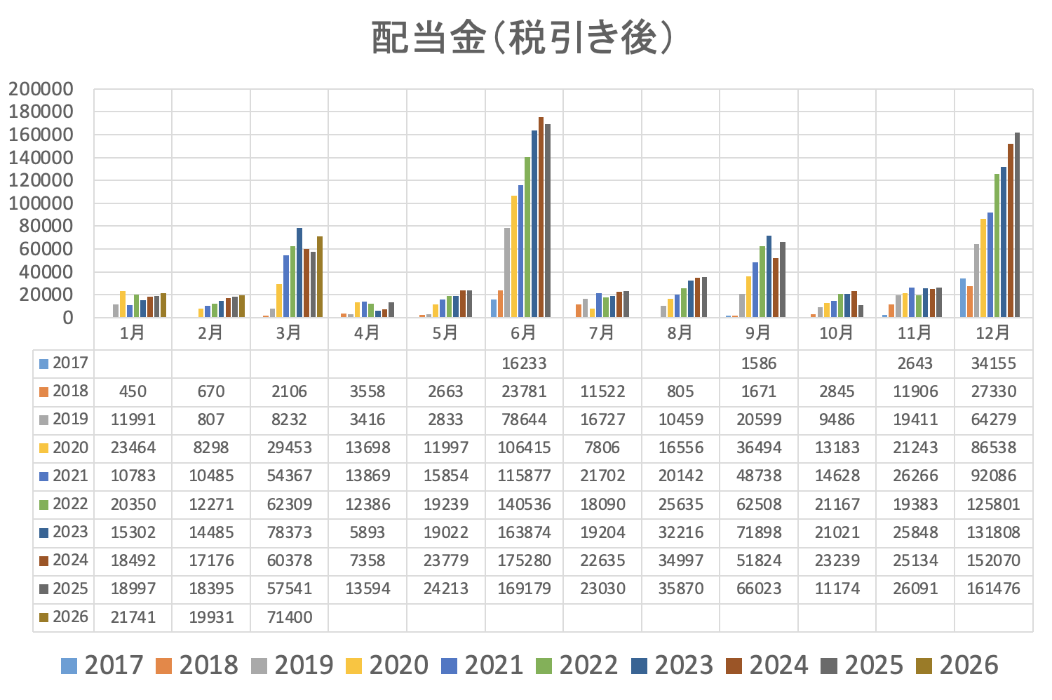 今まで5月に振り込まれていたQQQが3月に振り込まれたこともあり、昨年同月比で1万円以上のプラスになりました。