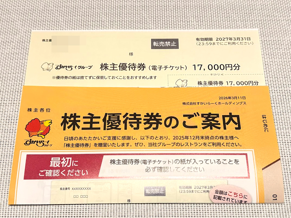 ⑧すかいらーく:優待券17,000円分(3/13着)